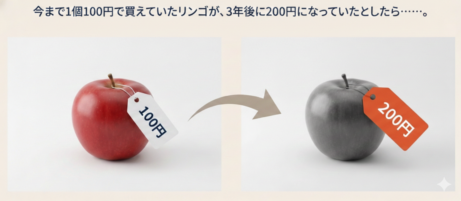 1個100円だったリンゴが3年後に200円になってしまったら、お金の価値はどうなると思いますか?
