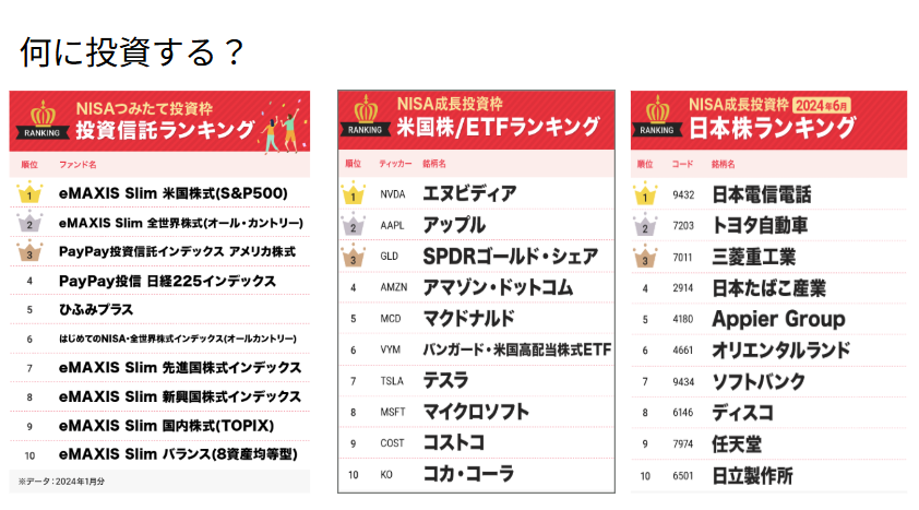 投資信託や個別株、S&P500やオールカントリー(オルカン)など、これもみなさんが聞いたことのある商品があるかもしれませんが、