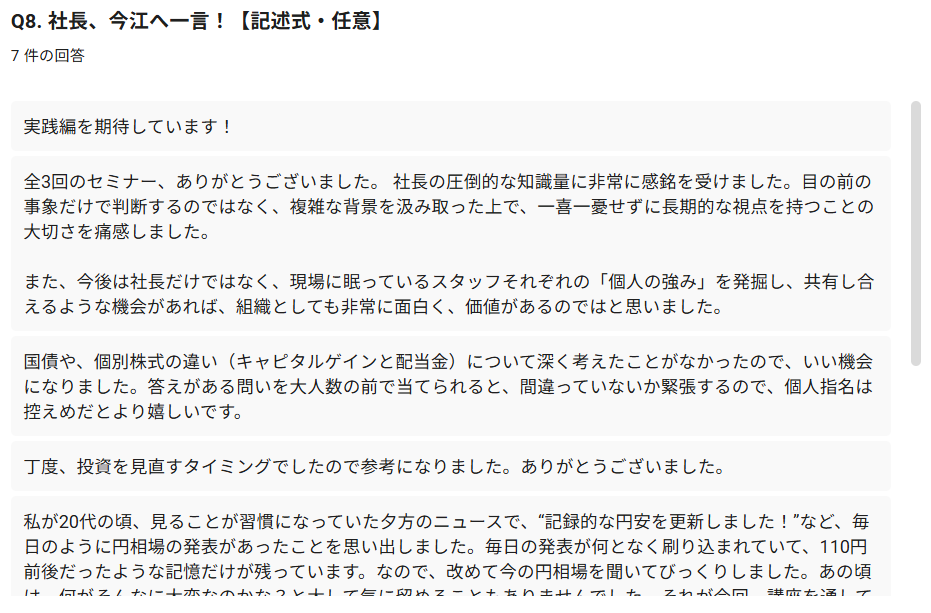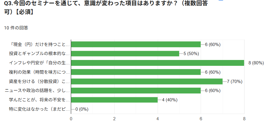 セミナー後のアンケートでは、8割以上の社員が「インフレや円安が自分の生活にどう影響するか理解できた!」と回答。