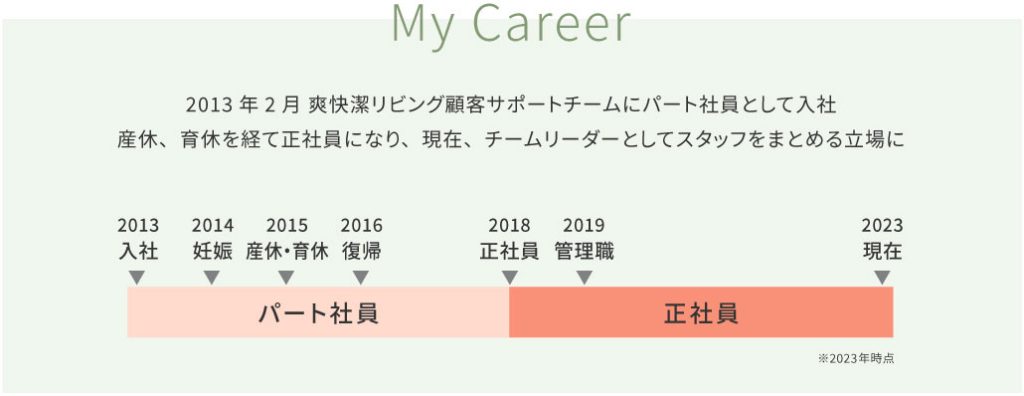 復帰後も、パートという立場に関わらず「やってみたい」という気持ちを尊重してもらえ、挑戦を後押ししていただきました。仕事を通して成長する楽しさを感じられるようになり、やりがいも実感しています。現在は正社員として管理職を任され、あの時諦めずに続けて本当に良かったと思っています。