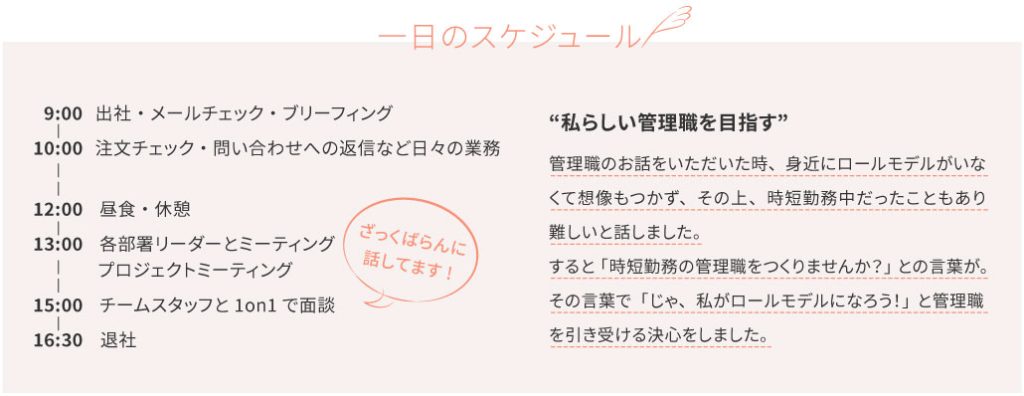 本当に多様性を大事にされていて、社員一人一人がそれぞれの強みを生かし、向上心を持って日々働かれているなと感じます。子育て、家庭を大事にしながらも、仕事でのやりがいがほしい!そんな方には、魅力的な職場だと思います。